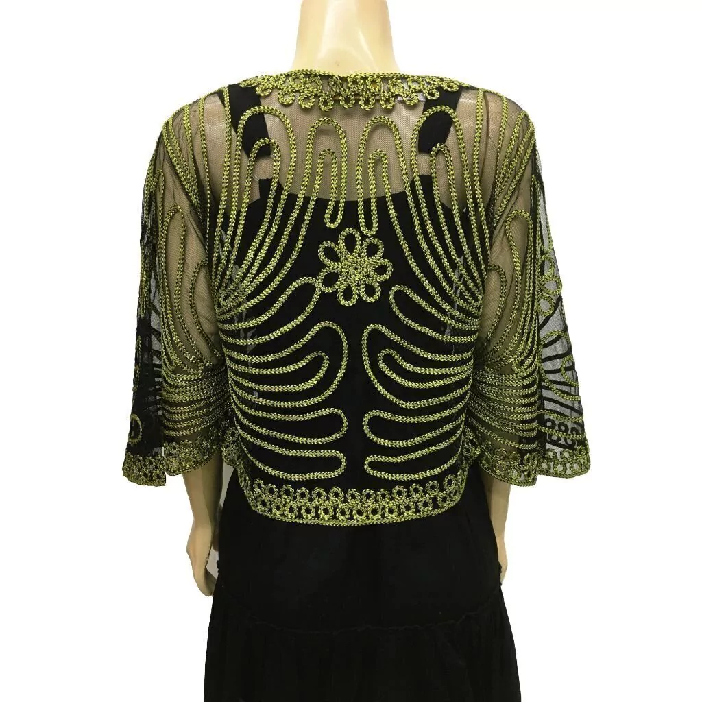 Bolero de tule com aplicação bordada, ideal para complementar blusas e vestidos mais decotados.