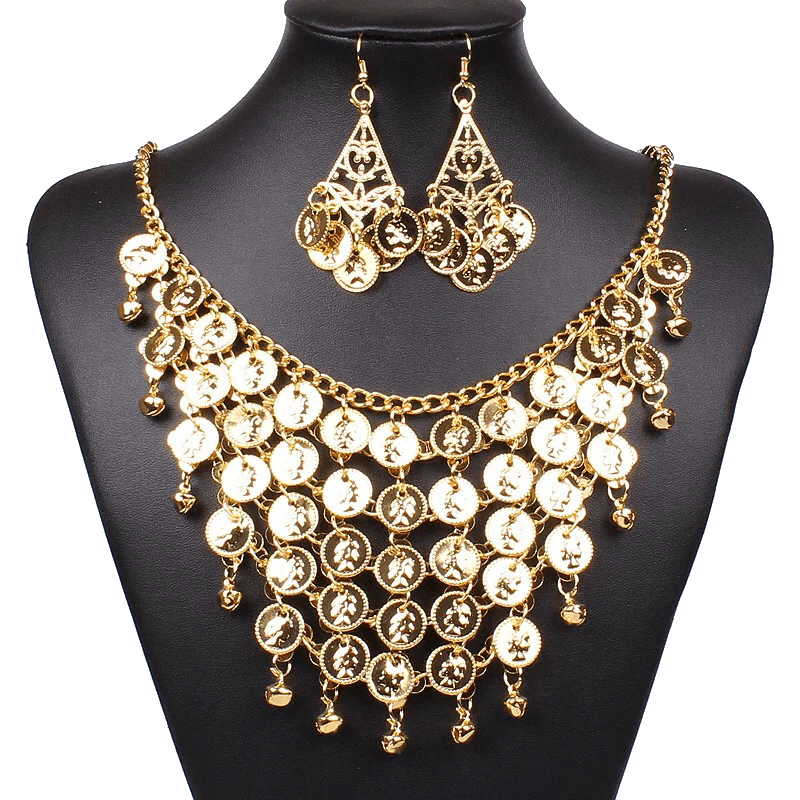 Conjunto contendo um colar e 1 par de brincos de moedinhas, ideal para diversos tipos de dança, além de composição de fantasias.