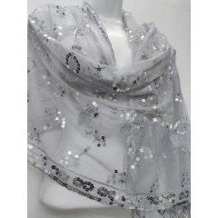 Echarpe de tule bordado em paetês, com lindo acabamento em franjas nas pontas.