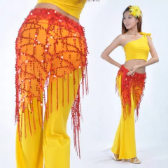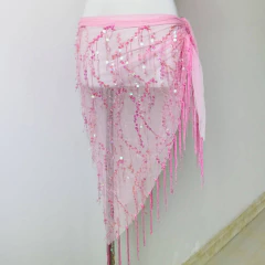 Xale em formato triangular ideal para amarrar no quadril, com aplicação de franjas de paetês que dão todo o brilho e efeito especial à peça.